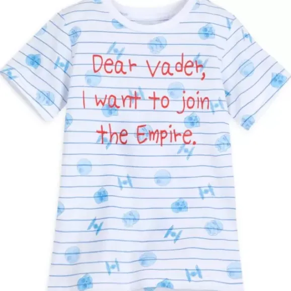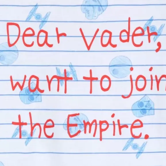 “Dear Vader, I Want To Join The Empire” Is Scrawled On A “Notepad-Striped” Ringer Tee Also Covered In Crudely Drawn Symbols Of The Sith Lord. Expose Your Youngling’s Questionable Ambitions With This Summery Style.