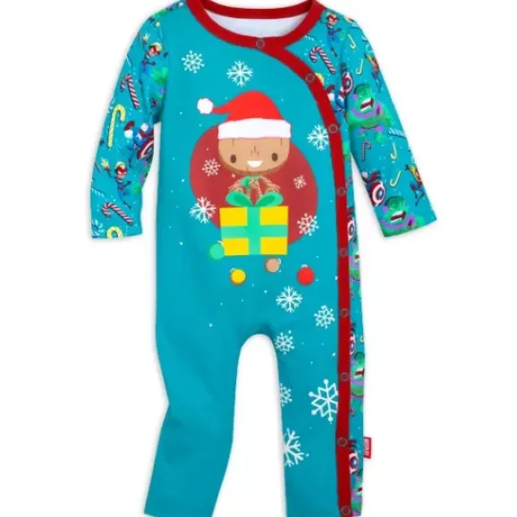 Your Favorite Marvel Characters Will Keep Your Little Super Hero Safe And Cozy This Holiday Season In This One-Piece. A Festive Groot Sits At The Center Of This Sleeper Surrounded By An Allover Print Of Christmas-Themed Marvel Characters.