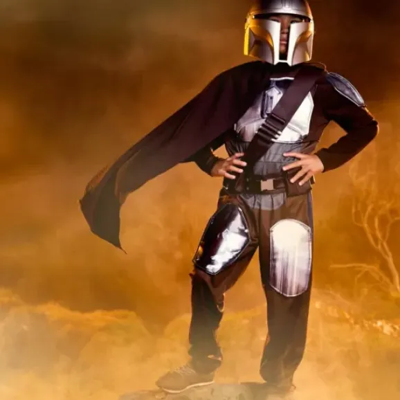 - Includes Full Mandalorian Bodysuit With Belt, Cape, And Helmet Mask